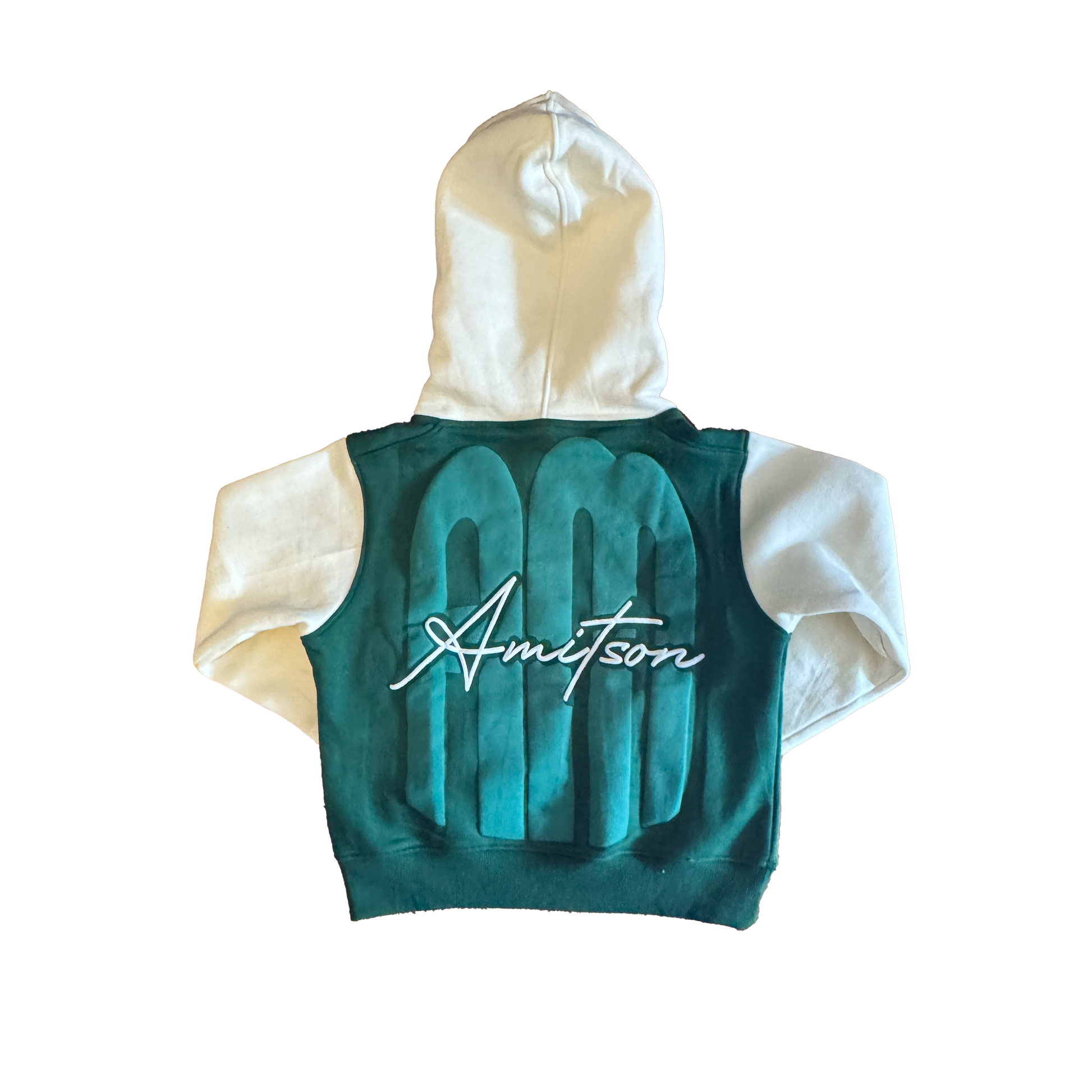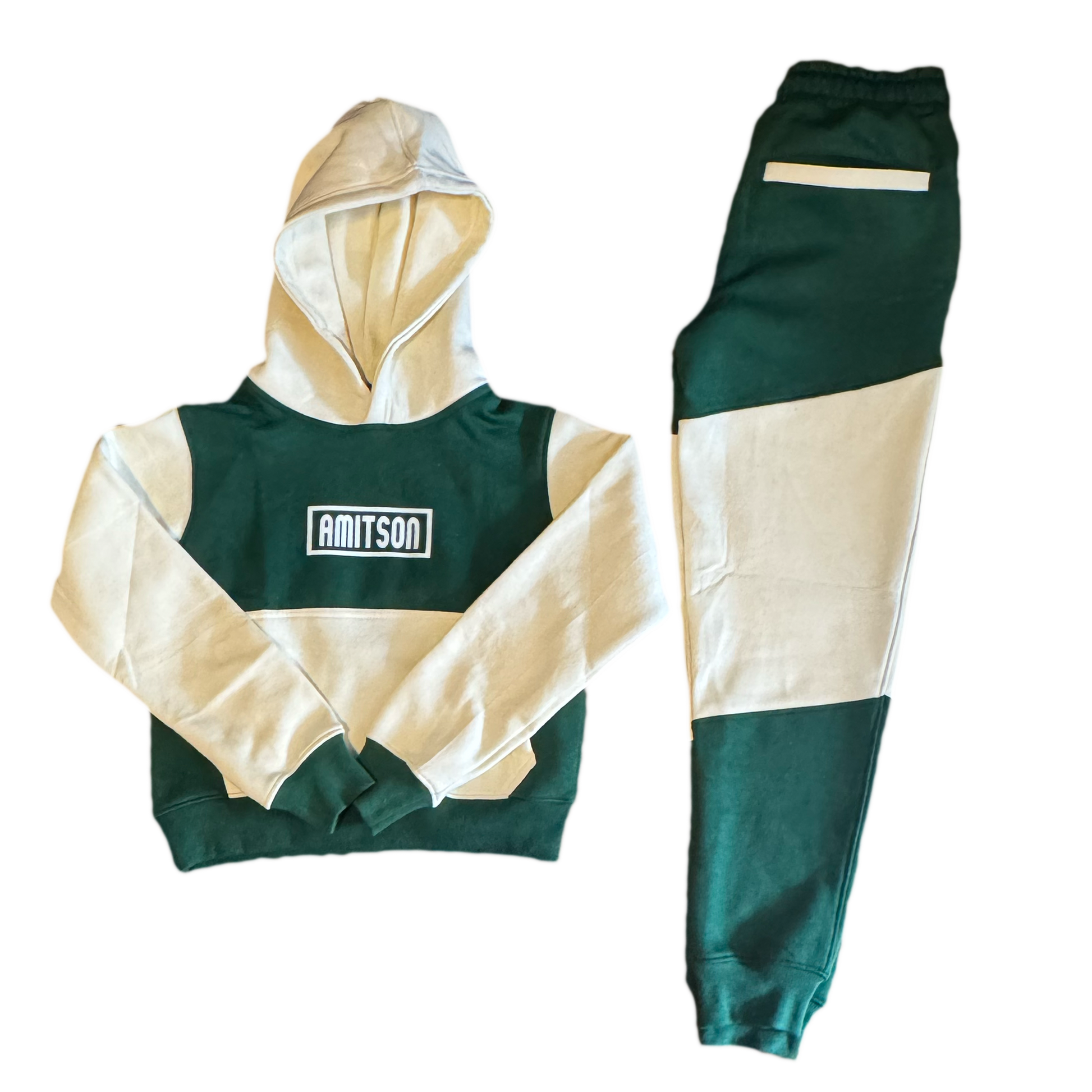 This limited edition Amitson tracksuit set includes a cropped hoodie and matching joggers, designed for a confident, elevated silhouette. Crafted from heavyweight cotton fleece with contrast paneling and finished with signature Amitson branding front and back, this set brings an intentional edge to everyday style.